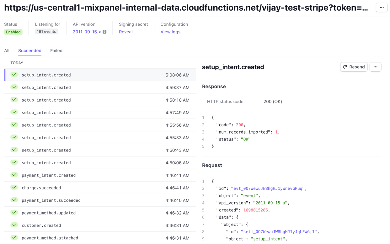Paste in the following code, which accepts Stripe’s webhook format, and forwards it to Mixpanel’s /import API: